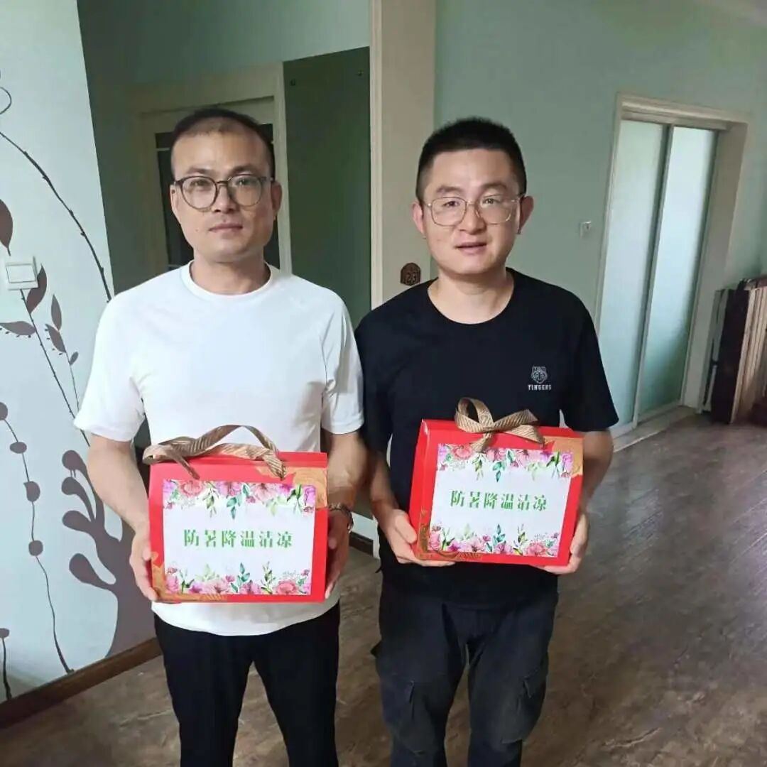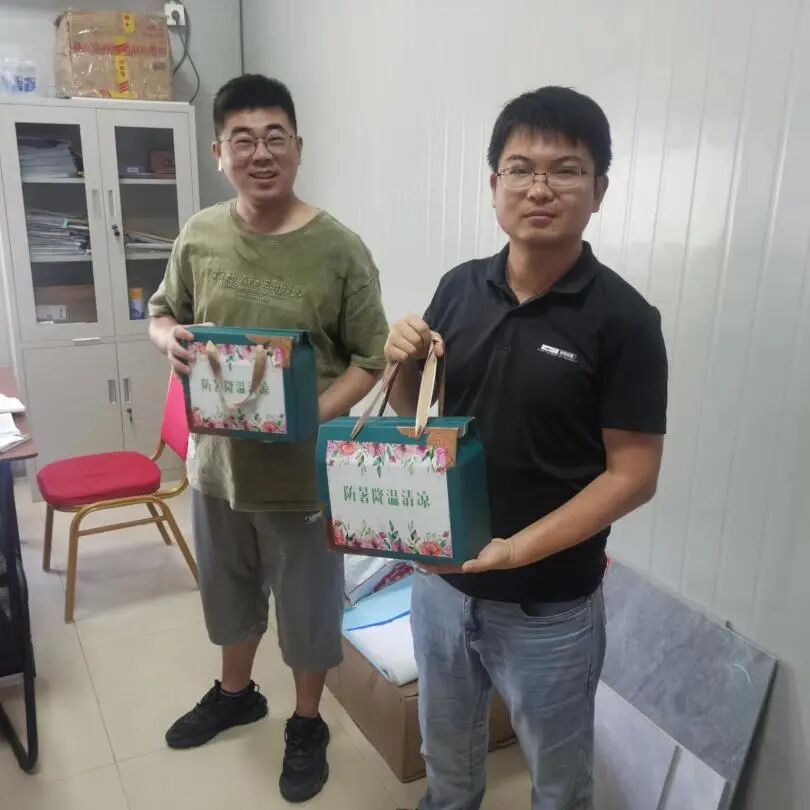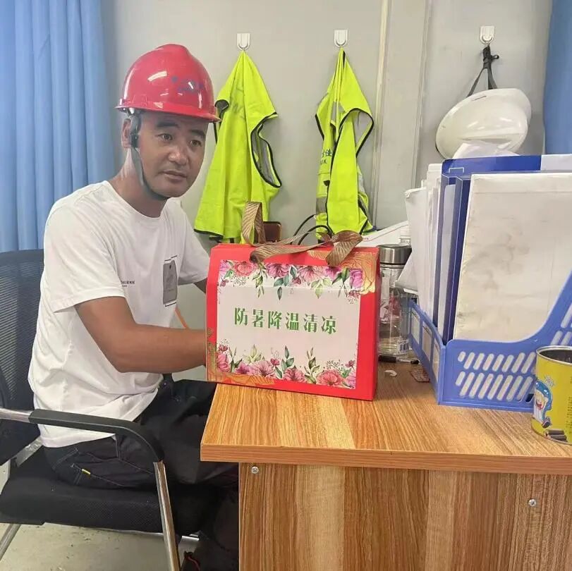 以项目部负责人蒋凤根为首的慰问小组深入到各个项目现场,为一线员工送去了防暑降温物资,也详细询问了大家的工作和生活情况。慰问小组向高温天仍坚守在岗位上的同事们致以敬意,感谢他们为项目建设和公司发展付出的汗水与心血,并反复叮嘱大家在高温期间要时刻注意防暑降温,加强自我防护,在确保工作质量的同时,更要注意个人安全和身心健康。