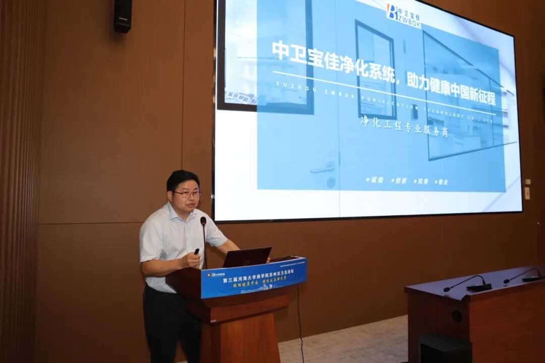 大健康产业作为国家战略新兴产业之一,对于推动经济转型升级、提升人民健康水平具有重要意义,本次论坛旨在搭建交流平台,促进产学研深度融合,共同为健康中国建设贡献力量。 论坛深入探讨了健康产业在中国经济转型升级中的重要作用以及商学教育如何为这一领域注入新的活力与智慧,汇集了来自学术界、产业界、政府部门及社会各界的精英人士,共同探索健康产业的新趋势、新机遇与新挑战。与会嘉宾围绕大健康产业的产学研协同进行了深入讨论,分享了各自的经验与见解,并就如何加强合作、共同推动大健康产业发展提出了宝贵建议。 张华 苏州中卫宝佳净化科技有限公司总经理 《中卫宝佳净化系统,助力健康中国新征程》 《“健康中国2030”规划纲要》在2016年被提出,是此后15年推进健康中国建设的行动纲领、战略主题,也是促进人的全面发展的必然要求、经济社会发展的基础性条件,更是每一家健康行业相关企业需要学习和践行的基本准则。 随着社会发展和人们生活水平的普遍提高,以及人类生活方式的改变,健康产品的总需求急剧增加。以生物技术和生命科学为先导,涵盖医疗卫生、营养保健、健身休闲等健康服务功能的健康产业成为21世纪引导全球经济发展和社会进步的重要产业。我国健康产业在医疗、卫生、保健、生命科学等领域取得了重大的成就,与之相互生的医疗产业、科研实验、药物研发与生产、智能化电子产业也存在着巨大的增量空间,而这些,恰恰也是我司发展的重要方向。 中卫宝佳净化系统一体化解决方案,通过详尽的需求确认、设计管理、施工管理、售后管理,关注业主真正的需求,实现传统按图施工到产品策划的行为模式转变,引导管理模式渐渐由项目执行向项目共创改变,为科研院所、实验室、药企、芯片厂、无尘车间、医院、康养中心等提供净化工程全生命周期的集成服务。 本次论坛的成功举办,不仅为大健康产业的企业、科研院所、高校搭建了交流合作的平台,也为健康中国建设注入了新的动力。未来,中卫宝佳定当坚守初心、勤勉加倍,继续做好医疗卫生事业的坚强后盾,为全中国人民的幸福安康贡献心力。