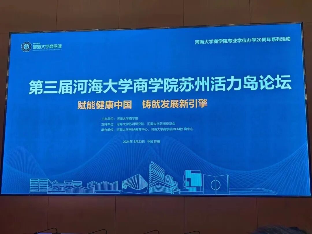 8月23日下午,以“赋能健康中国,铸就发展新引擎”为主题的第三届河海大学商学院苏州活力岛论坛在河海大学苏州研究院举行。本次论坛由河海大学商学院主办,河海大学MBA教育中心、河海大学商学院MEM教育中心承办,并受到河海大学苏州研究院、河海大学苏州校友会的大力支持。我司总经理张华也应邀参与,并发表主题演讲。